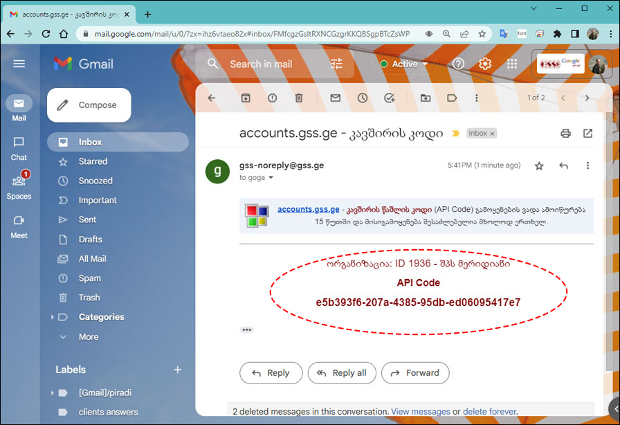 ელ. ფოსტაზე მიღებული ‘კავშირის წაშლის კოდი’ შეიტანება ‘პარამეტრების’ ფანჯრის ‘gss.ge’ ჩანართში